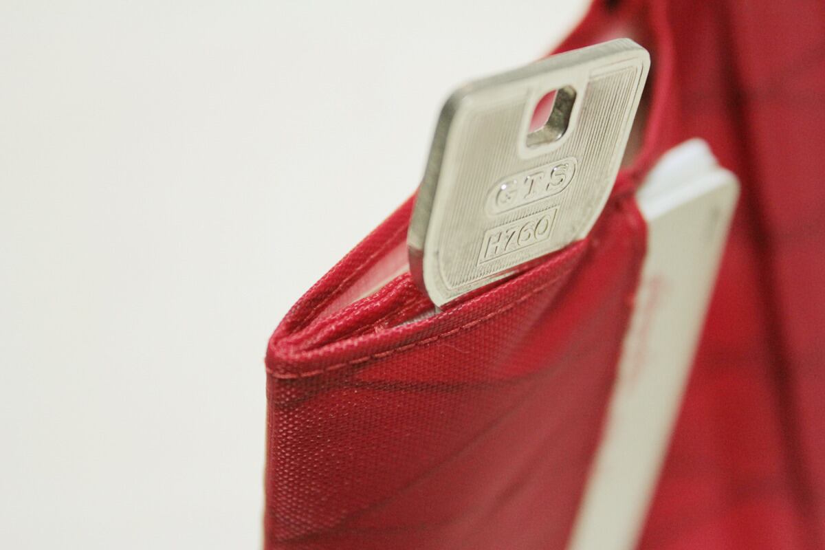 サイフを閉じたときにはループになっていた黒いストラップ用ナイロンテープが、開いたときには三角形になり、指を引っかけて札入れの開閉を容易にします。